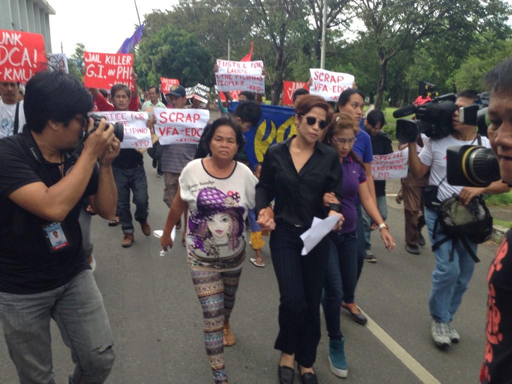 A photo tweeted by GMA News reporter Rida Reyes showed protesters carrying placards and signs calling for the jailing of Pfc. Joseph Scott Pemberton.