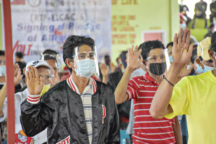 Over 200 former rebels and supporters from Tapaz, Capiz and Calinog, Iloilo take their oath of allegiance to the government during the “VOLTing in for Peace” facilitated by the Regional Task Force to End Local Communist Armed Conflict on Jan. 8. IPPO