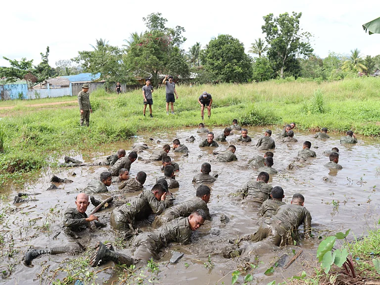 ZAMBOANGA. The Army’s 64th Infantry “Knights” Battalion (IB) warmly welcomes the 38 newly assigned privates to the unit through the traditional reception rites at its headquarters in Tumahubong village, Sumisip, Basilan province, on Saturday, January 6. A photo handout shows the new soldiers swimming in murky water in a shallow pond at the 64IB camp as part of the reception rites. (SunStar Zamboanga)