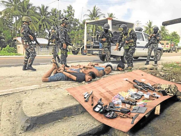 Lt. Col. Harold Cabunoc, commander of the Army’s 33rd Infantry Battalion, said police arrested Dante Karatuan, 34; Roy Datukali, 22; Jomar Jainal, 20; Gale Mangandaong, 20; and Jerry Talib, 39, in a house in Barangay Kayaga here for allegedly trading illegal drugs and supplying firearms to rebels.