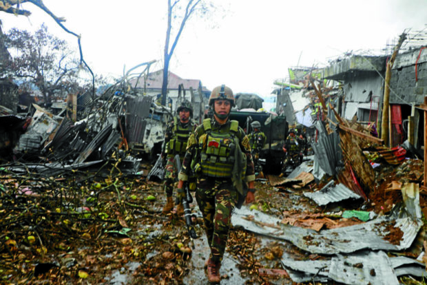 Soldiers walk through the rubble of what used to be a Maute-controlled area in Marawi City. —ARMED FORCES OF THE PHILIPPINES