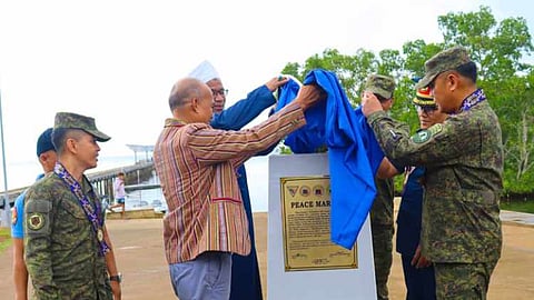 ZAMBOANGA. Mayor Alih Sali of Akbar, Basilan province (clad in Yakan weaved cloth), and Brigadier General Alvin Luzon, 101st Infantry Brigade commander (right) lead the unveiling of a Peace Marker in a ceremony declaring the municipality as Abu Sayyaf Group-free and Rido-free on Tuesday, June 18. The marker was unveiled as a symbolic act of the municipality’s new status. (SunStar Zamboanga)
